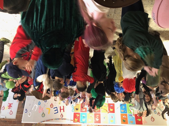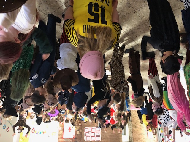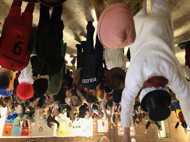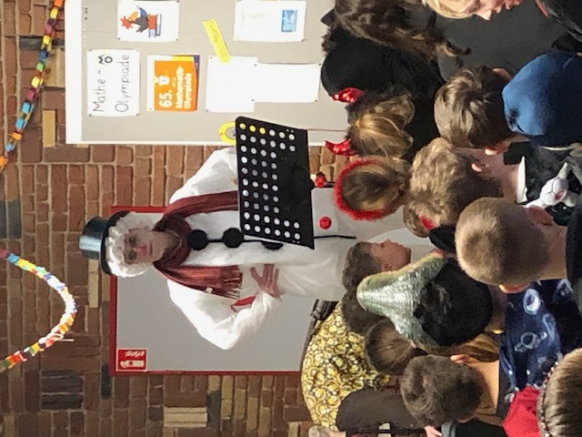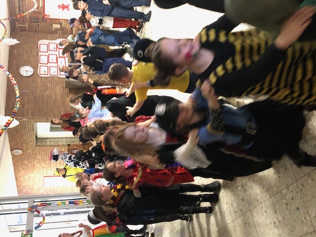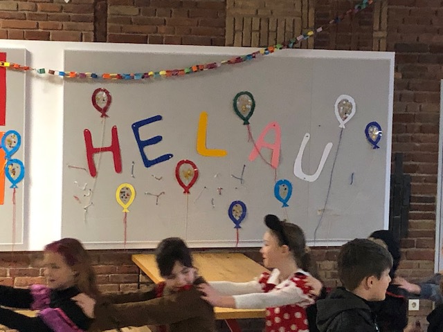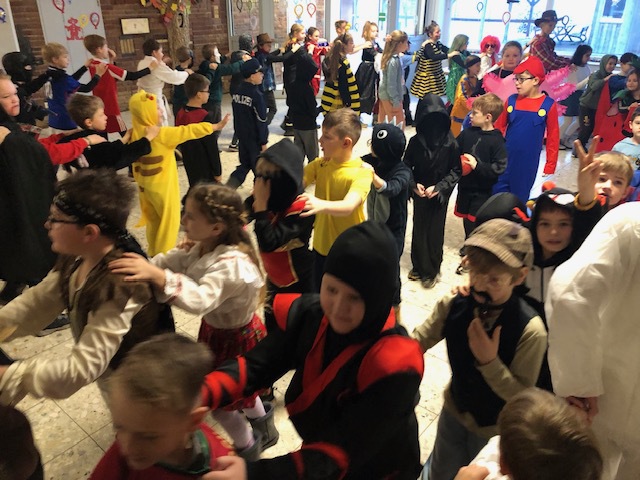 Nachdem sich am Rosenmontag alle Kinder kurz in den Klassen getroffen haben, um ihre Kostüme zu präsentieren und den Ablauf zu besprechen, ging es mit einer Polonaise in die Aula. Dort hielt die Schneefrau Frau Kiy eine Büttenrede und die "Gute Laune" wurde durch Gesang und Tanz so richtig gestartet.
