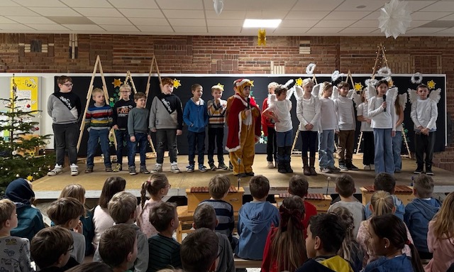In der Adventszeit ist es an der Grundschule Badbergen Brauch, dass die Schulgemeinschaft jeweils an den Montagenin der ersten Stunde gemeinsam in der Aula Advent feiert.